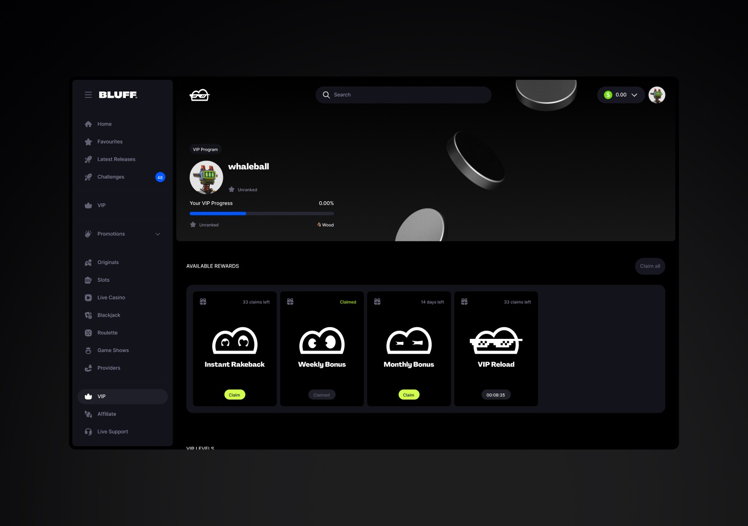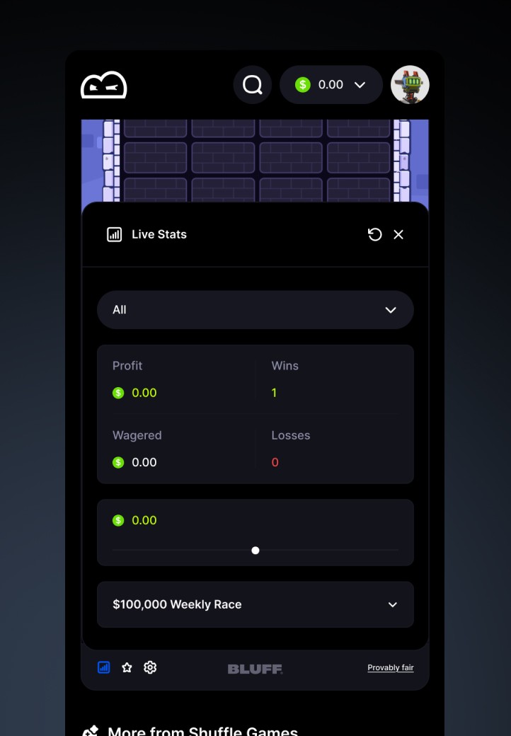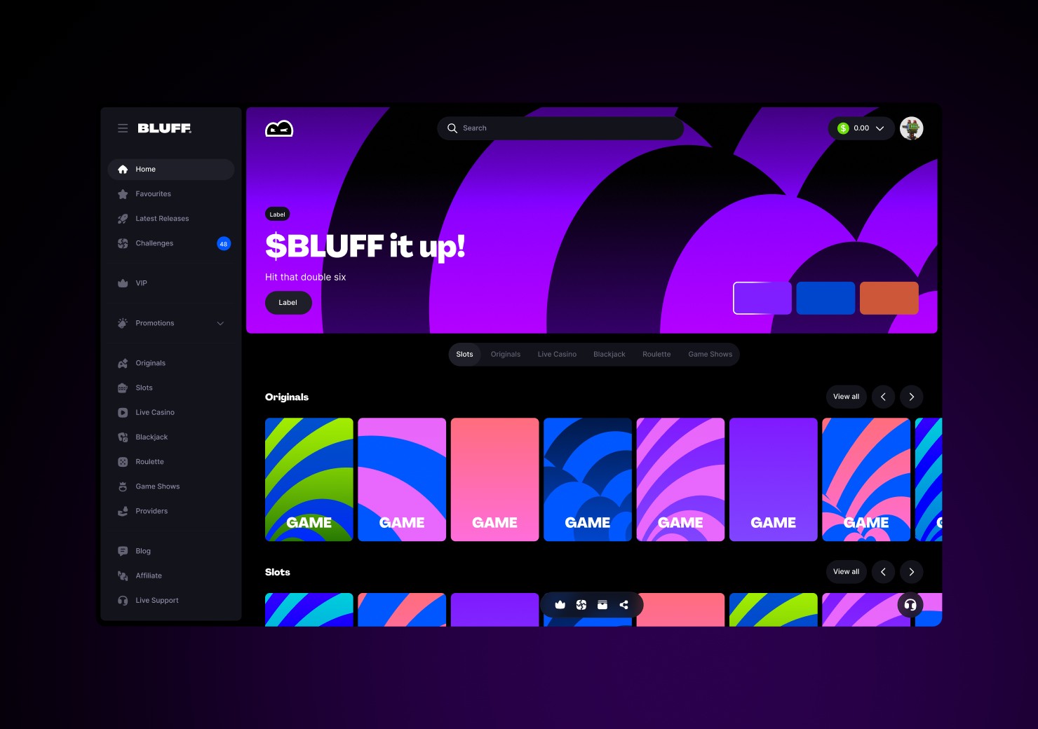 Bluff is a web3 casino built for speed and expression. We partnered with the team to shape a bold brand system and carry it through the product experience, balancing high-impact visuals with clear, intuitive gameplay.