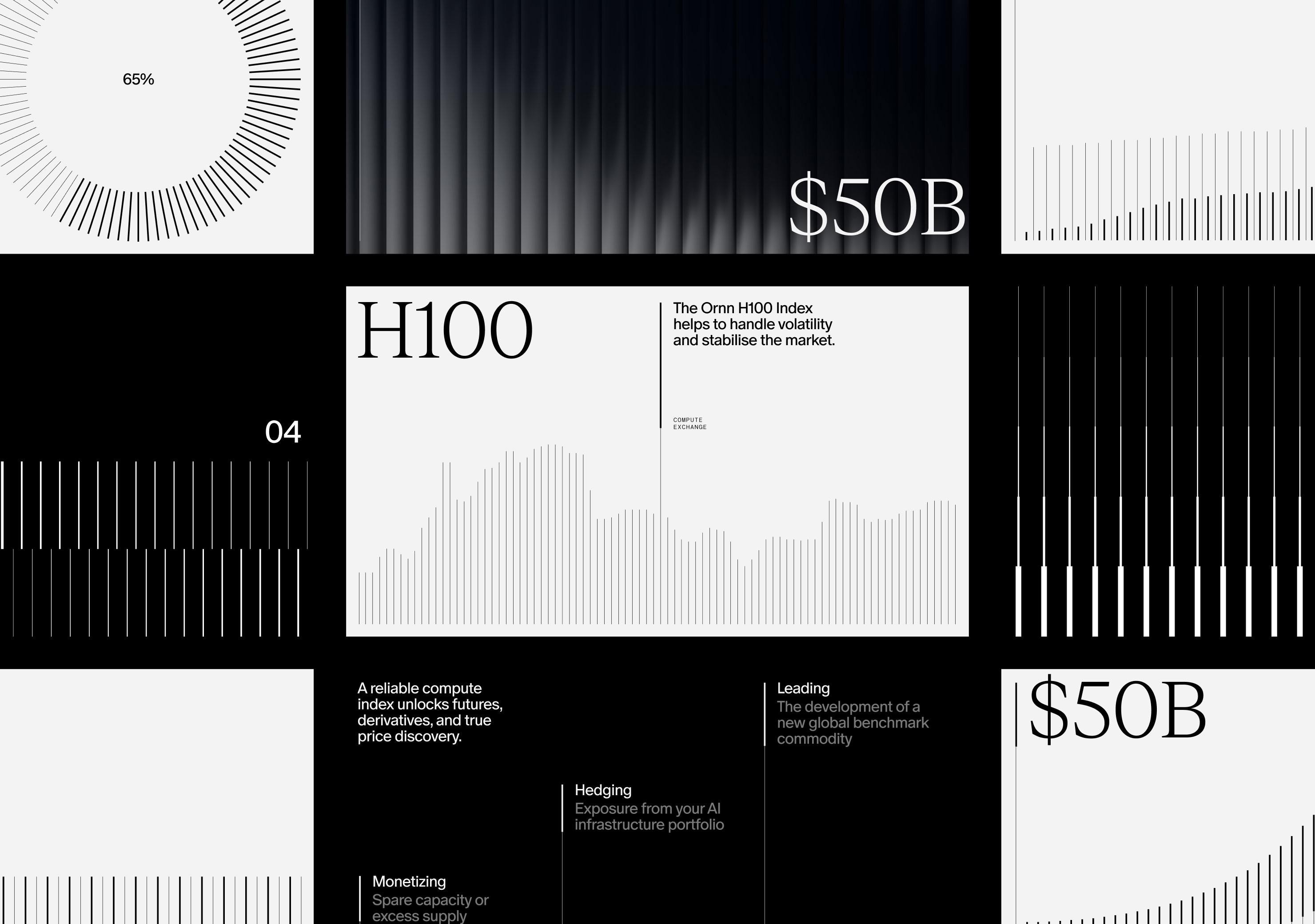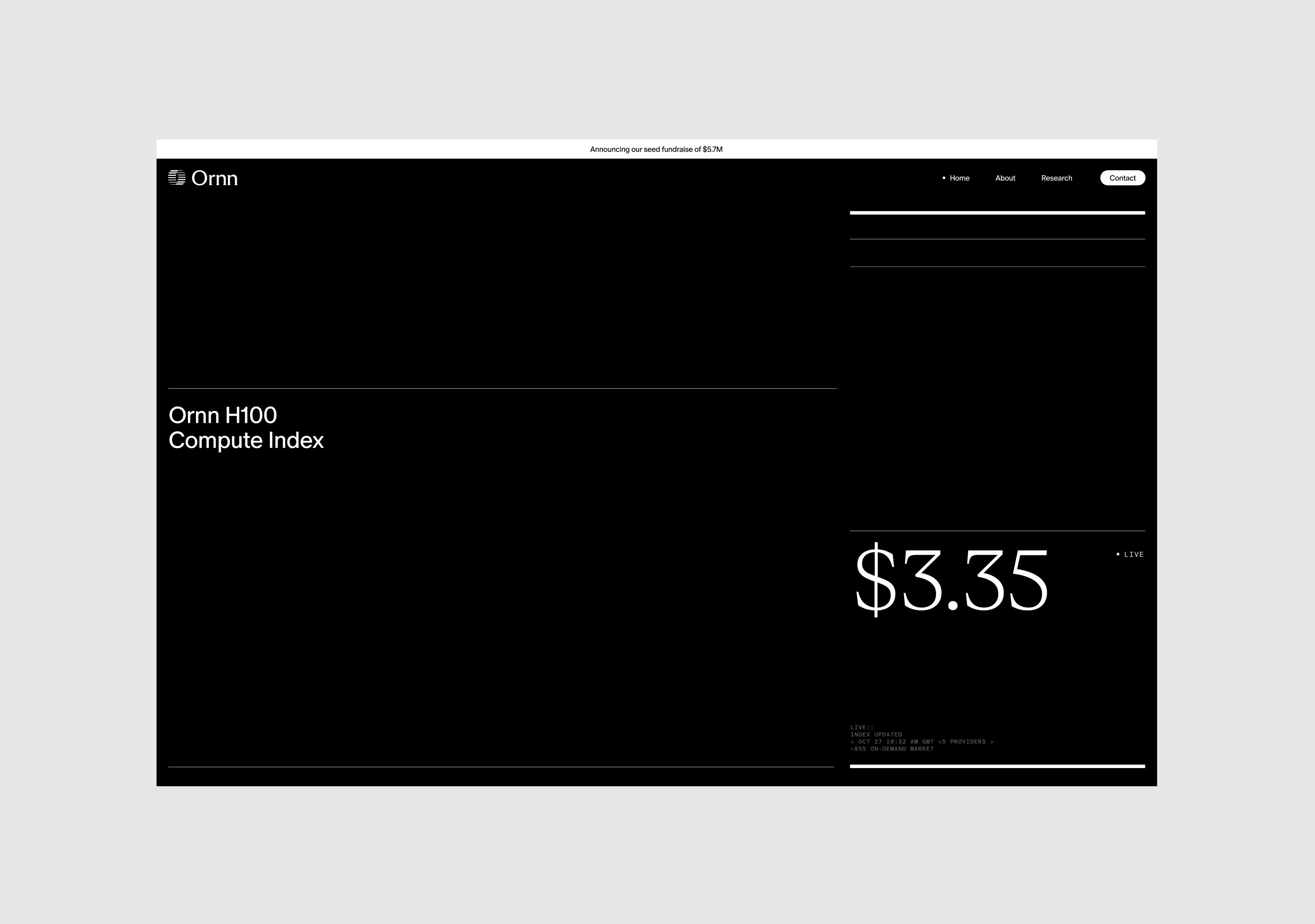 Ornn came to us after raising $5.7M with a clear goal: elevate their brand and digital presence to match the scale of their ambition. They needed an identity that would give investors confidence as they write six-figure-plus cheques to fuel their flagship product, the H100 — an index built to define the next dominant commodity of the AI era: compute. Our challenge was to combine the credibility of a trusted financial institution with the forward-leaning vision of a company building tomorrow’s infrastructure. The brand needed to feel authoritative today and inevitable tomorrow.